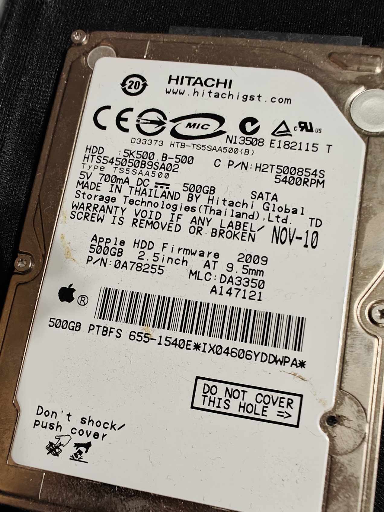 | Unknown/Old MacBook drive | Hitachi | Hitachi_HTS545050B9SA02_101112PBL40017K4W47N | HTS545050B9SA02 | 500GB |