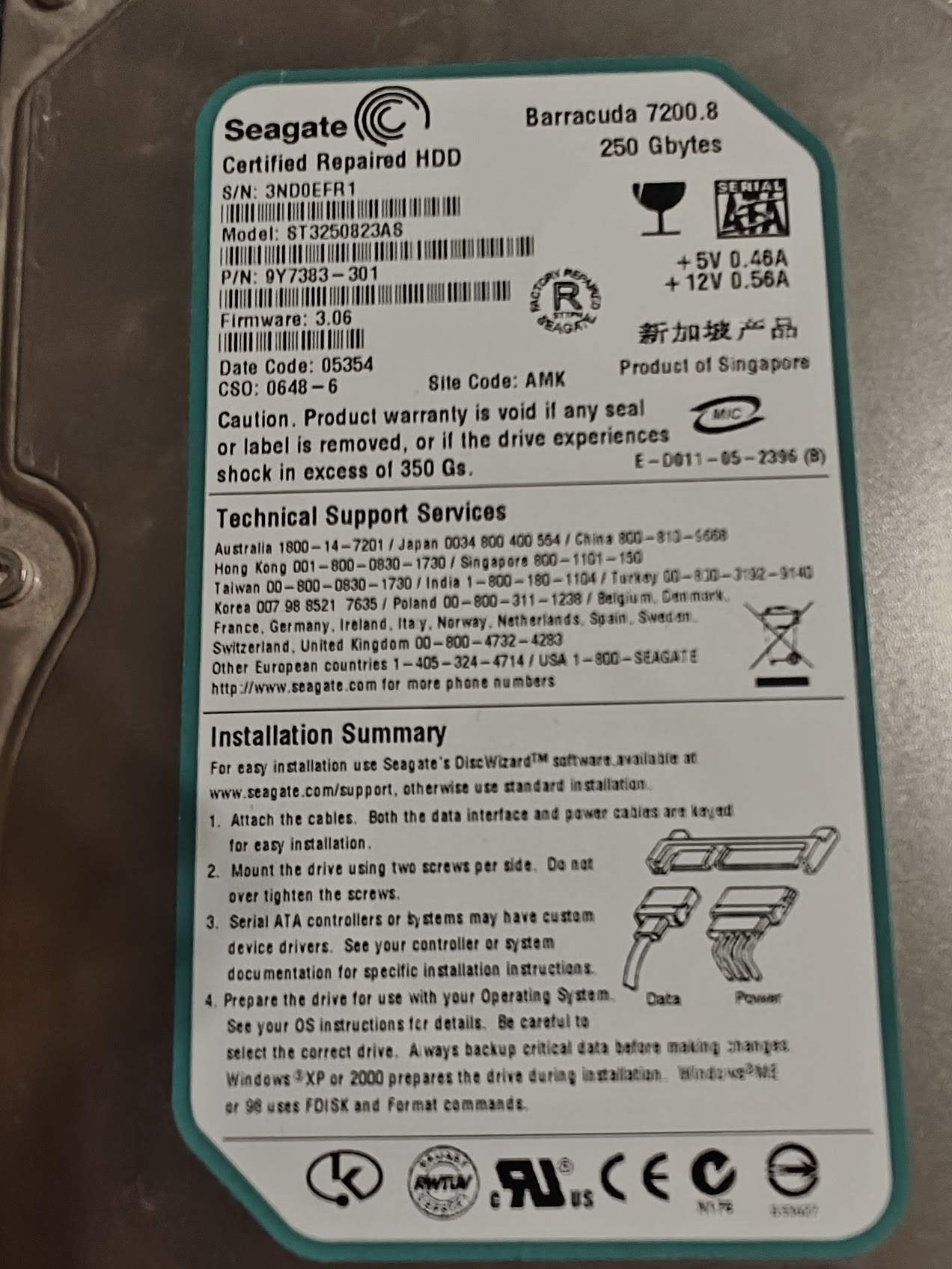 | Unknown | Seagate | ST9320325AS_5VD07Y6D | ST3250823AS | 3ND0EFR1 | 250GB | cloned to /mnt/taketwo/driveClone | |