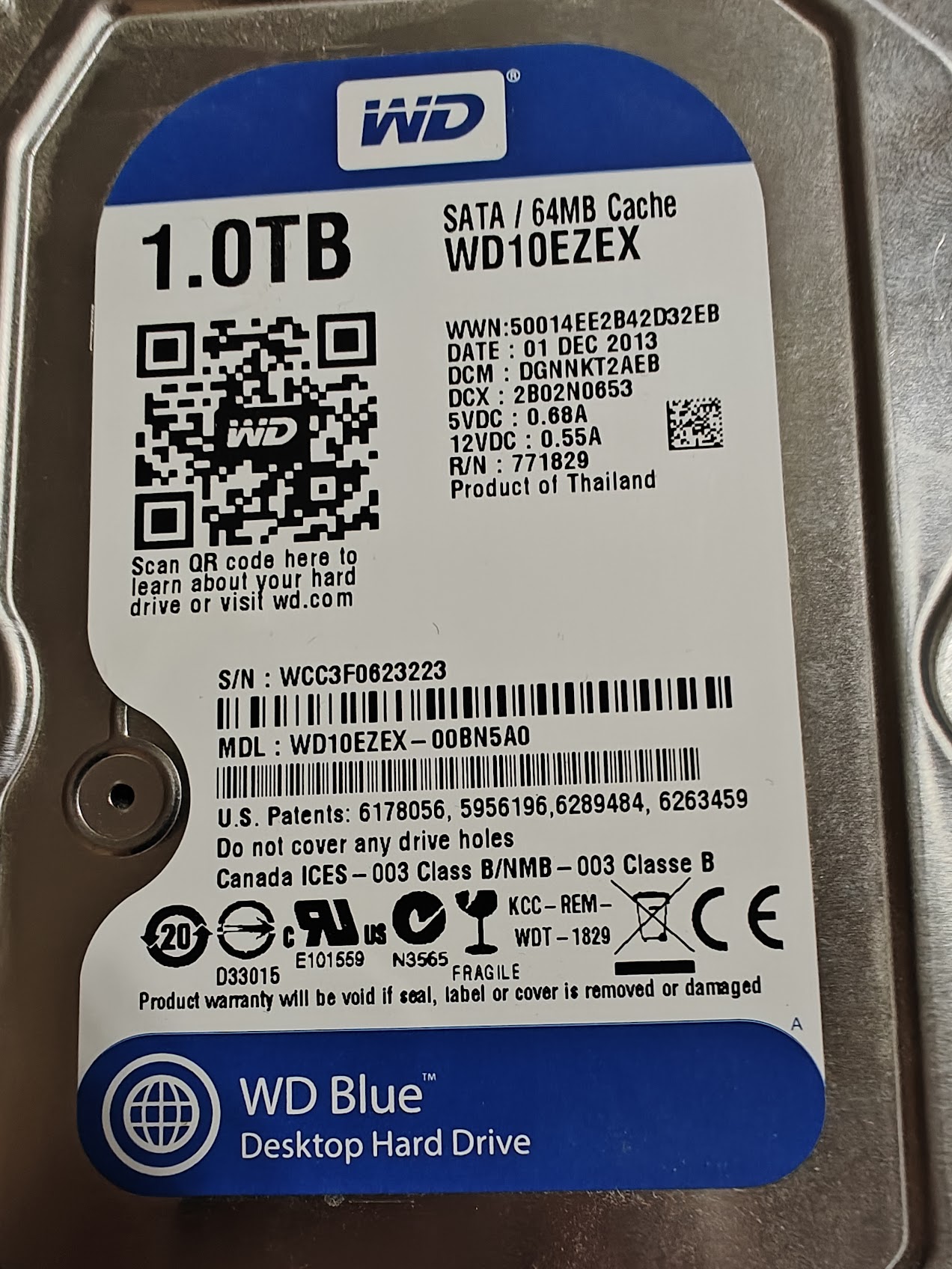 | 1TB work drive/c8T | WD | WDC_WD10EZEX-00BN5A0_WD-WCC3F0623223 | WD10EZEX-00BN5A0 | WCC3F0623223 | 1TB | cloned to /mnt/taketwo/driveClone | |