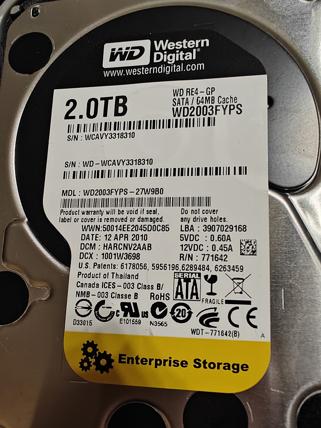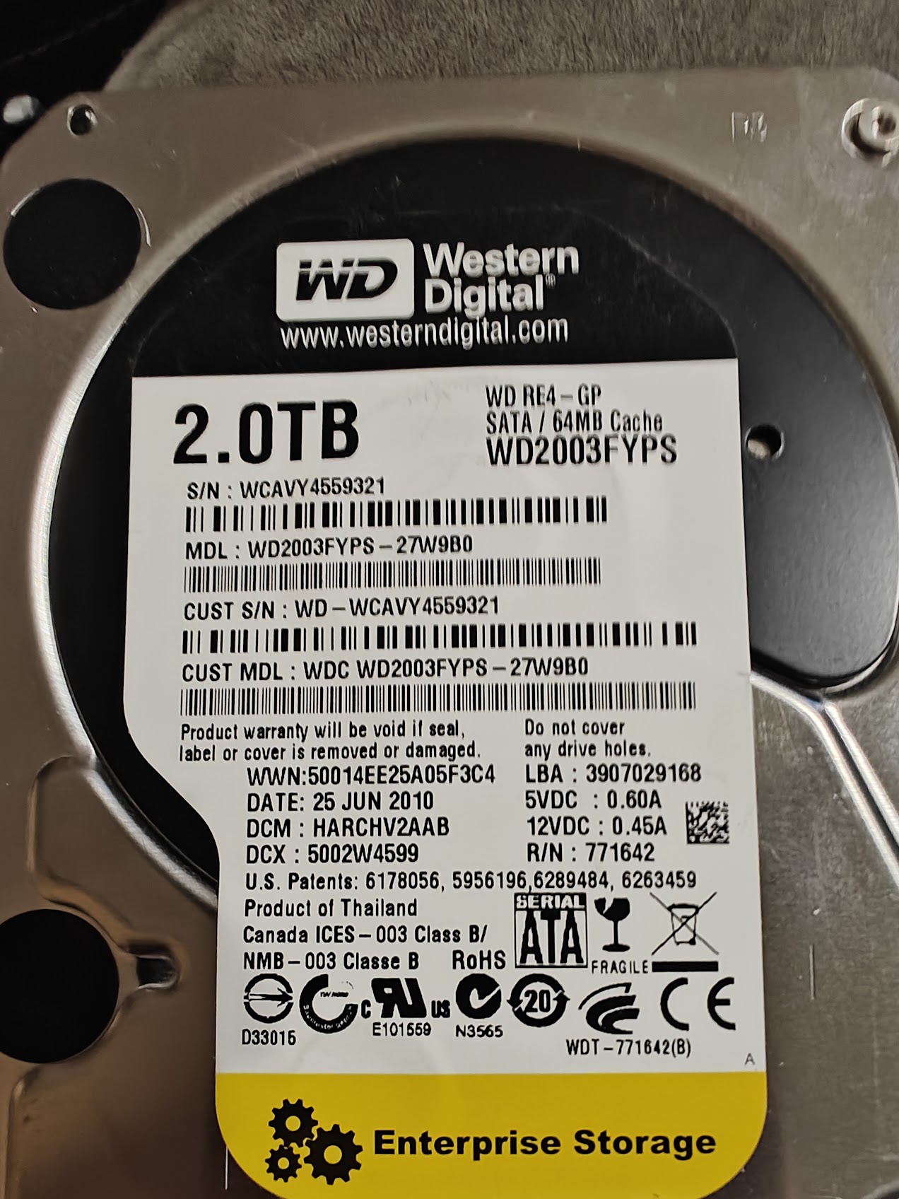 | Jars/Storage | WD | WDC_WD2003FYPS-27W9B0_WD-WCAVY3318310 | WD2003FYPS-27W9B0 | WCAVY3318310 | 2TB | cloned to /mnt/taketwo/driveClone | |