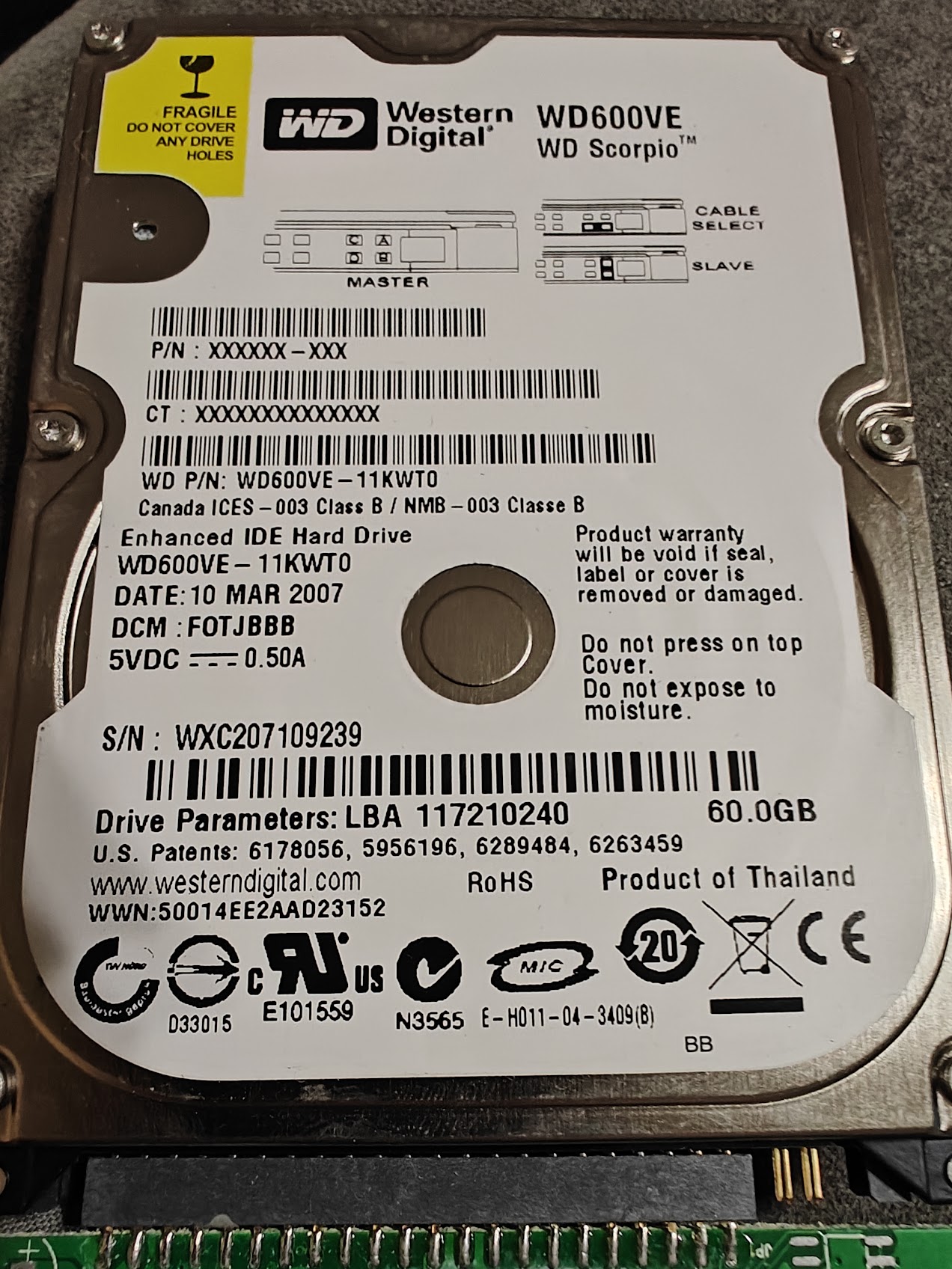 | Unknown/Old MacBook drive (in small black enclosure) | WD | WDC_WD60_0VE-11KWT0_D578C2071032-0 | WD600VE-11KWT0 | WXC207109239 | 60GB | Cloned to /mnt/taketwo/driveClone/ | |